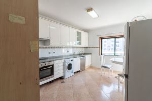 Cozinha grande equipada com placa, forno, exaustor, frigorifico, microondas, máquinas de lavar louça, roupa e de secar,
