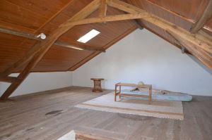 Uma casa com um amplo salão multiusos e um espaço de lazer. Uma casa com forno a lenha, rústico, e um espaço amplo com wc.